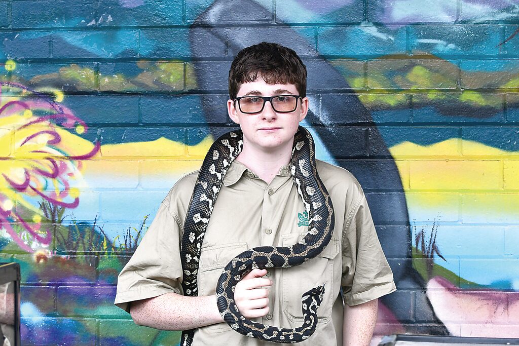 Calev from Renegade Reptiles showing off lizards and snakes to the public.