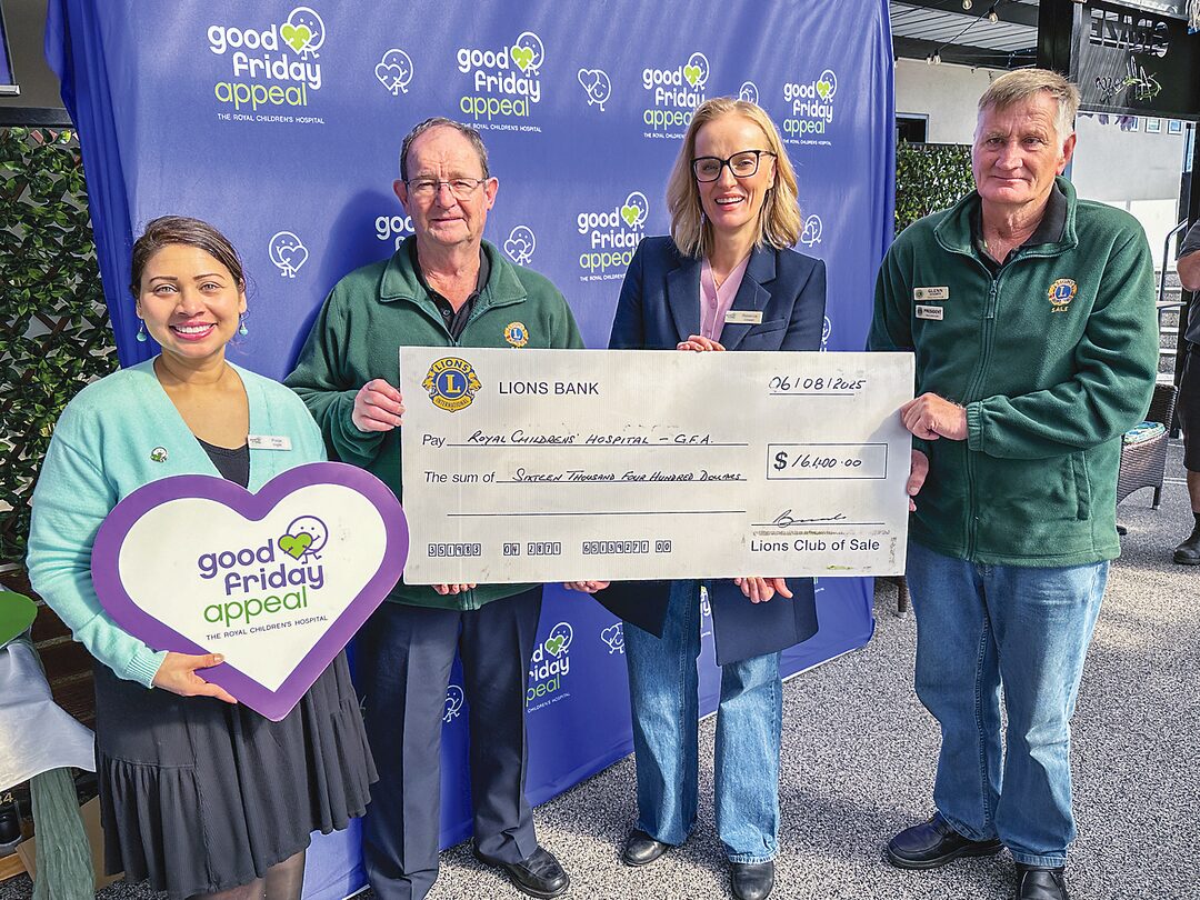 From left, Pooja Ingle, Frank Birthisel (Sale Lions Club), Rebecca Cowan and Glenn Bennett (Sale Lions Club), with a big cheque for $16,400 for the Good Friday Appeal.