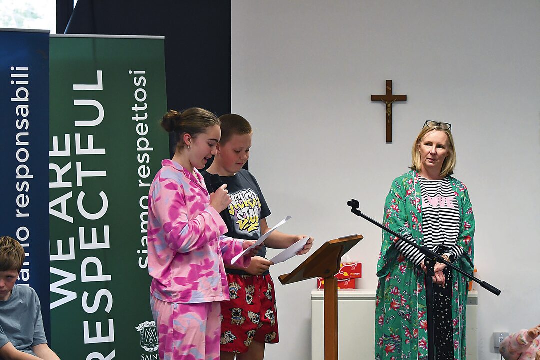 April and Hamish led a chant at St Mary's Primary School, Sale about what Gippsland's Biggest PJ Day is about. Photo: Erika Allen
