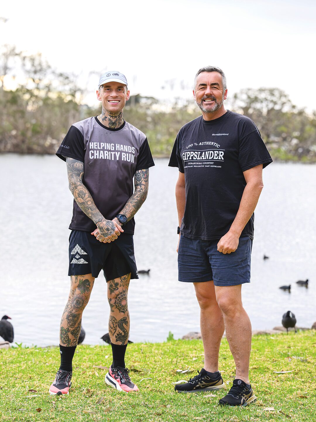 Federal Member for Gippsland Darren Chester (right) joined ultra-distance runner Chris Dixon for a run around Lake Guthridge in Sale ahead of the Helping Hands Charity Run. Photo" Contributed