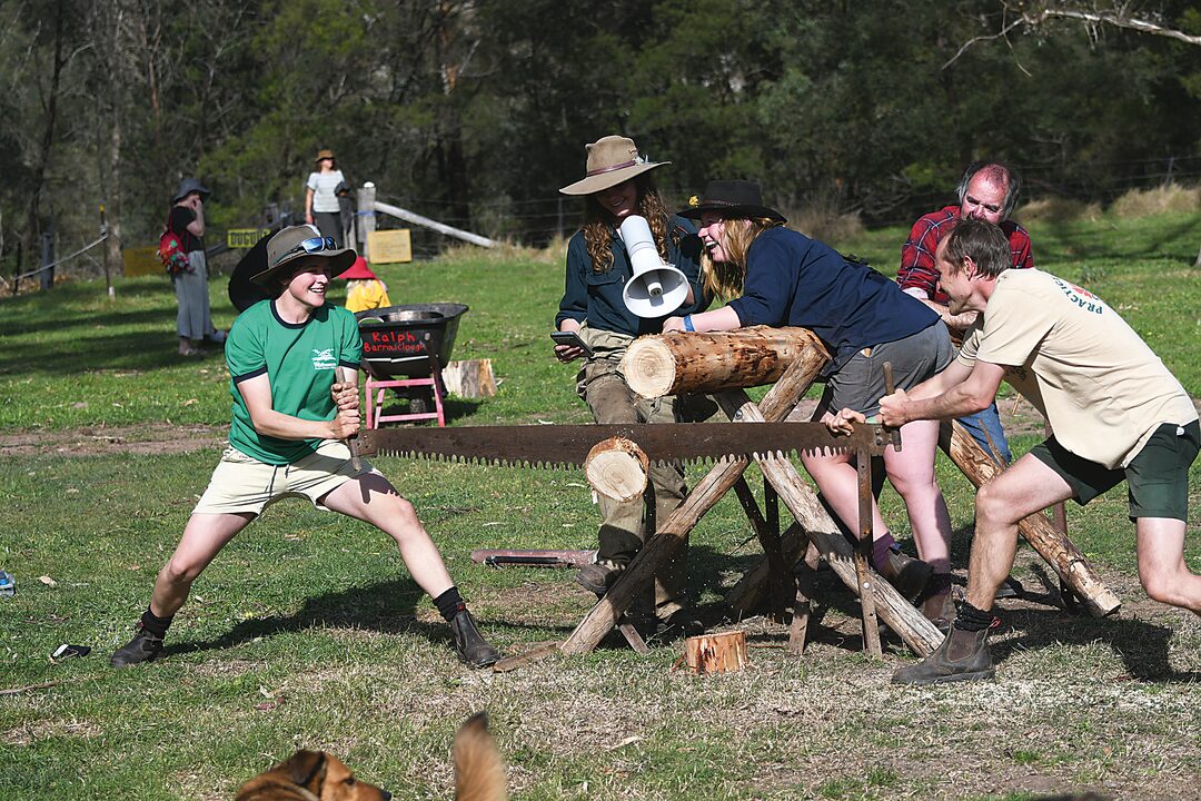 Saw cutting competition with Josh Tucker (right) and Clancy finishing with a time of one-minute, ten seconds.