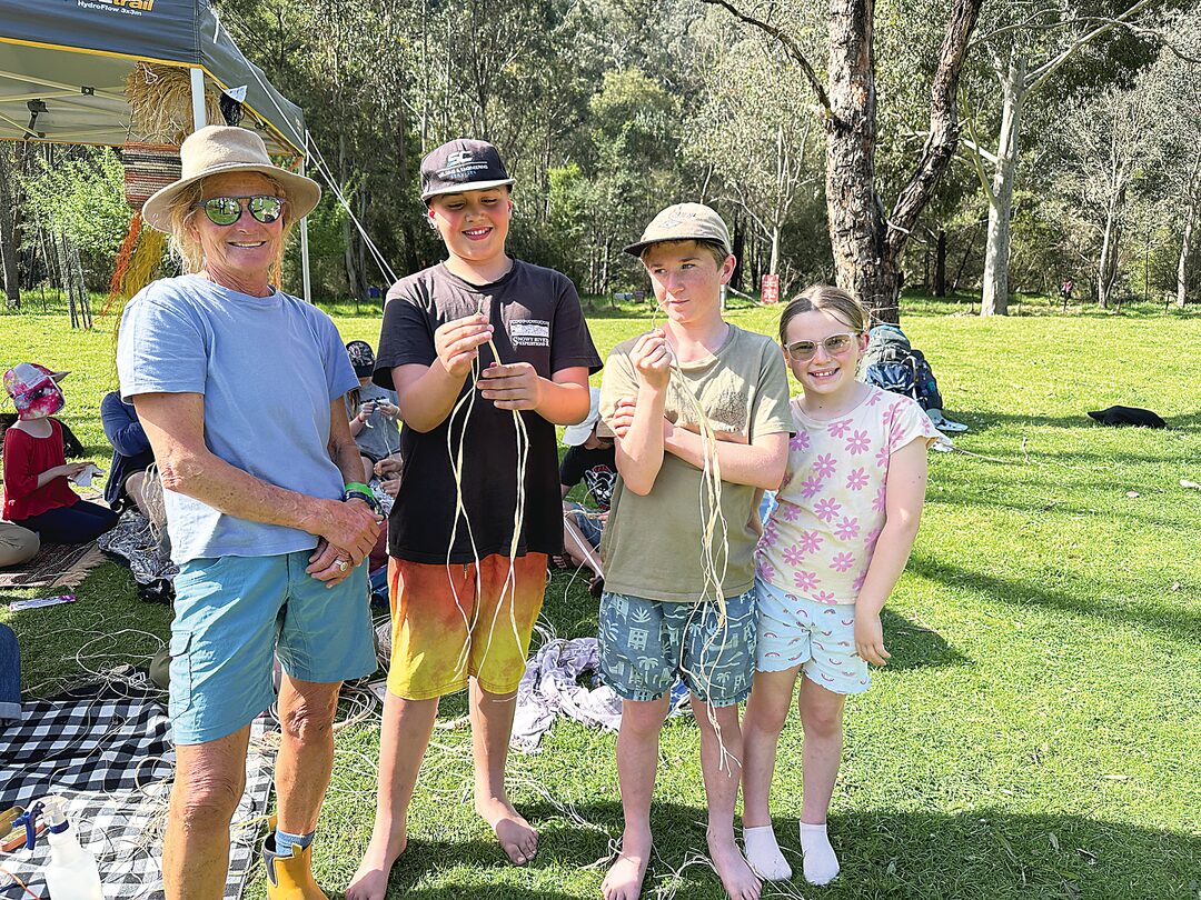 Alice (left) showing Fletcher, Campbell and Olivia basket weaving.