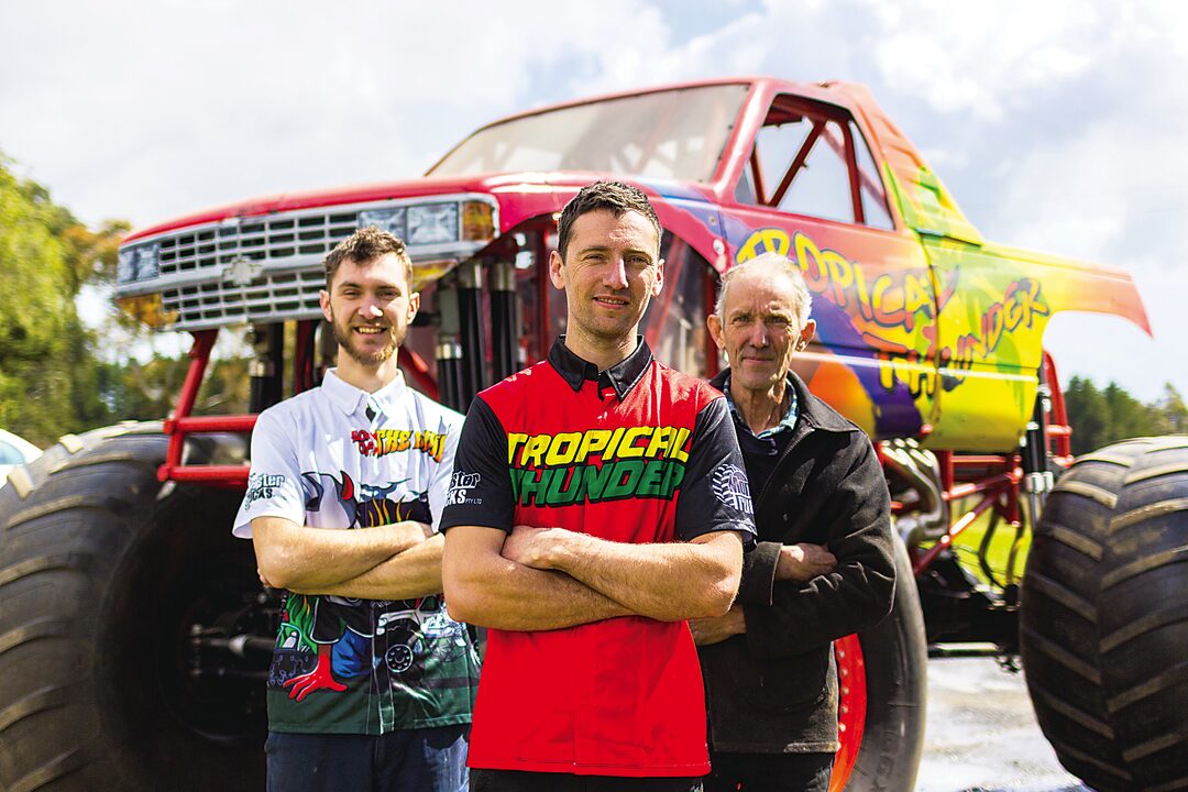 Michael Xuereb (centre) will attempt a world-first monster truck stunt in a performance alongside brother Jarryd (left) and father Sam (right) at the Sale Show.