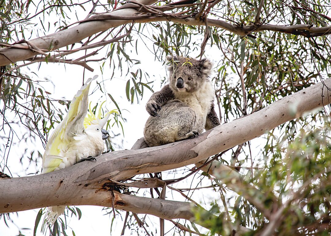 The koala turns to the cockatoo as if to say, ‘What did you do that for?’