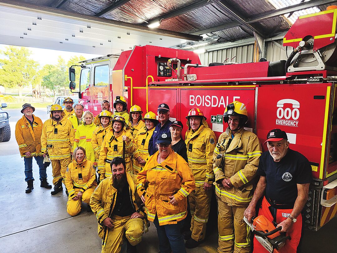 Boisdale brigade volunteers in their day job and volunteer attire, Phil Sim, Paul Bawden, Paul Chilton, Stuart Noble, Luke Chilton, Tammy Chilton, Abbey Walsh, Foster Crooke, Shirley Newman, Laurie Smith, Tim Crooke, Bob Newman, Sharon Sim, Dee Dorber, Imogen Chilton, Kate McIntyre holding Millie with Georgie and Heidi, Andrew Noble and Kirstine Smaller.