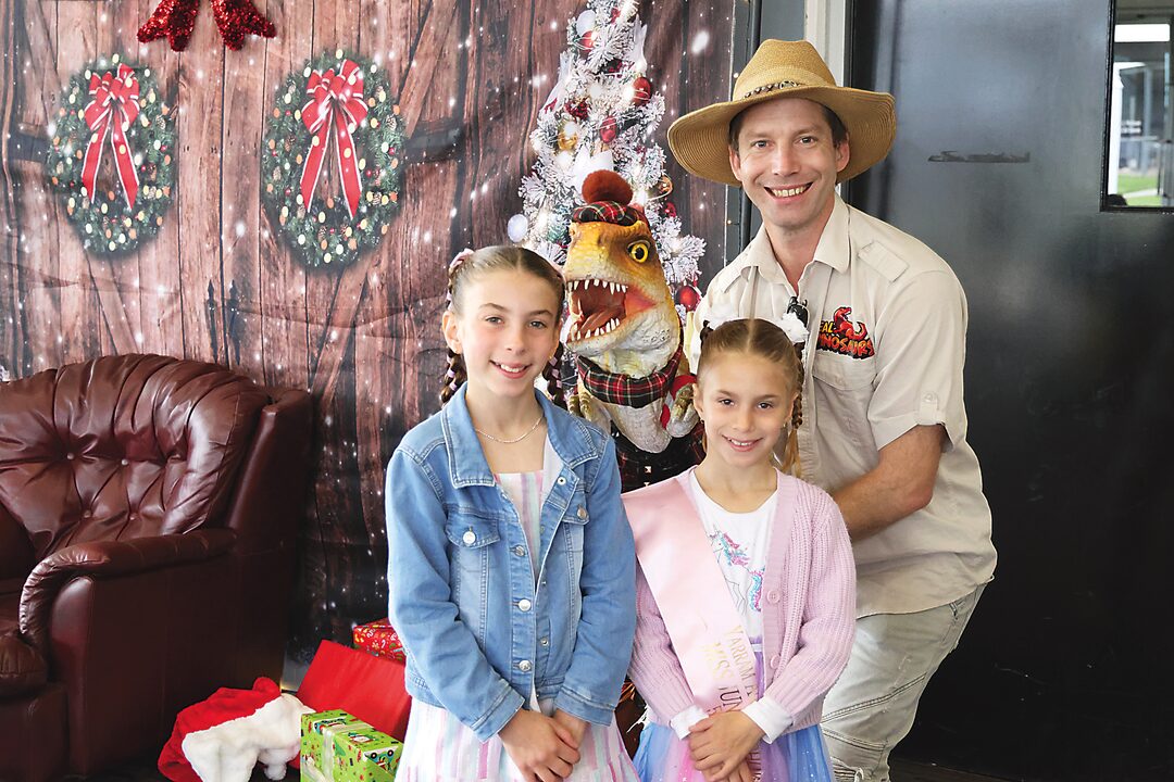 Roving Dinosaurs says hello to the Aliberti sisters at the Yarram Show. Photos: Deb Lucas