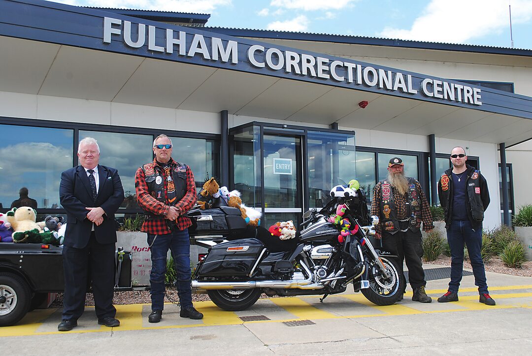 Mark Stevens, acting general manager Fulham Correctional Centre, with Red Knights International Firefighter Motorcycle Club members including Chapter 6 president Andrew Young, vice president Neville McKenzie and quartermaster Matt Lovelace.
