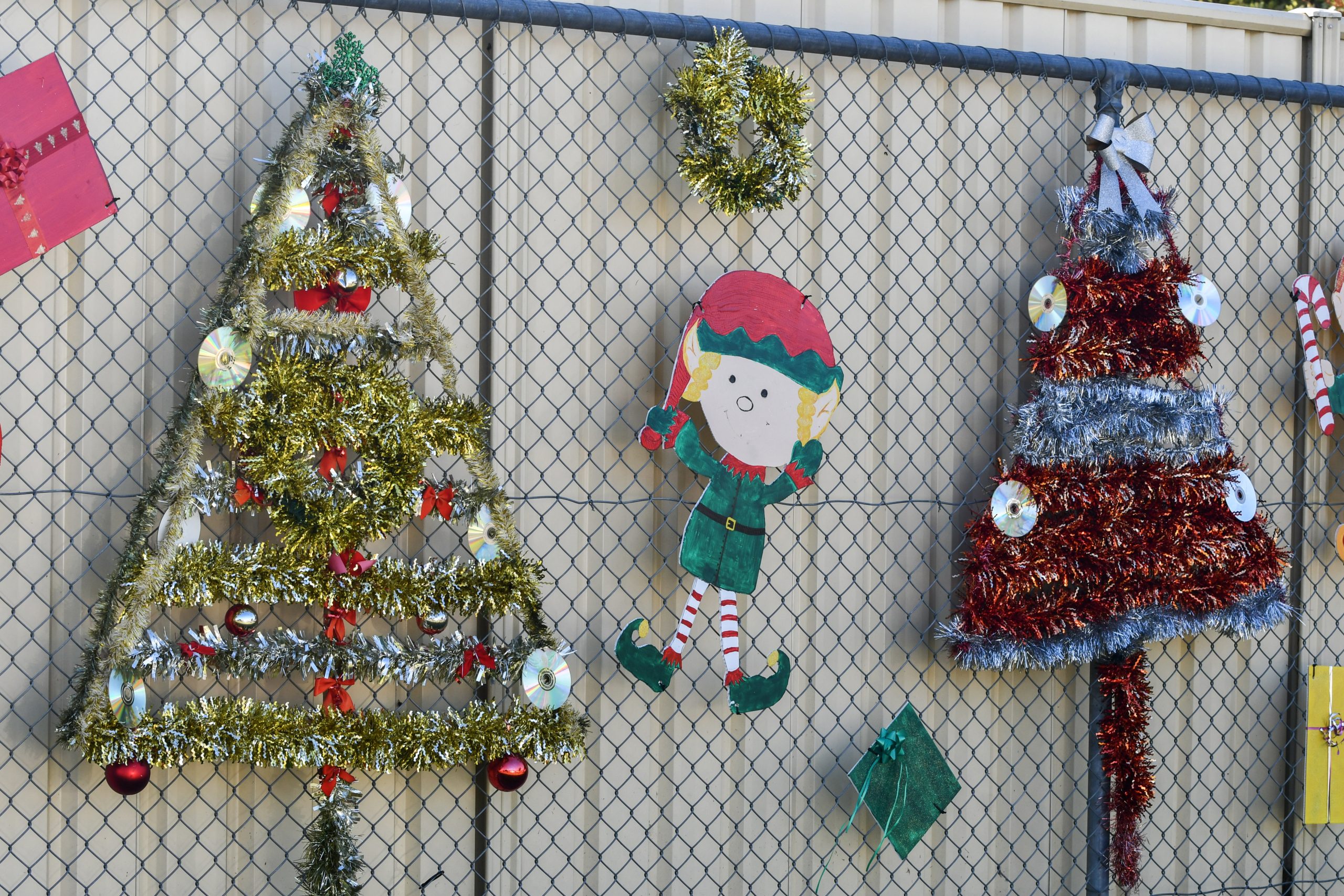 Tinsel trees with old CDs catch the eyes of passersby, while handpainted elves and presents fill the gaps along the Stratford Bowls Club fence.