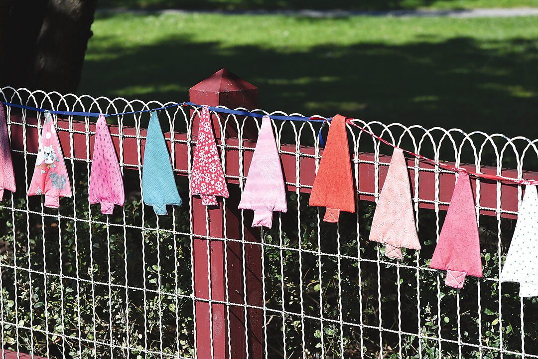 Hand sewn bunting along the Memorial Park fence.