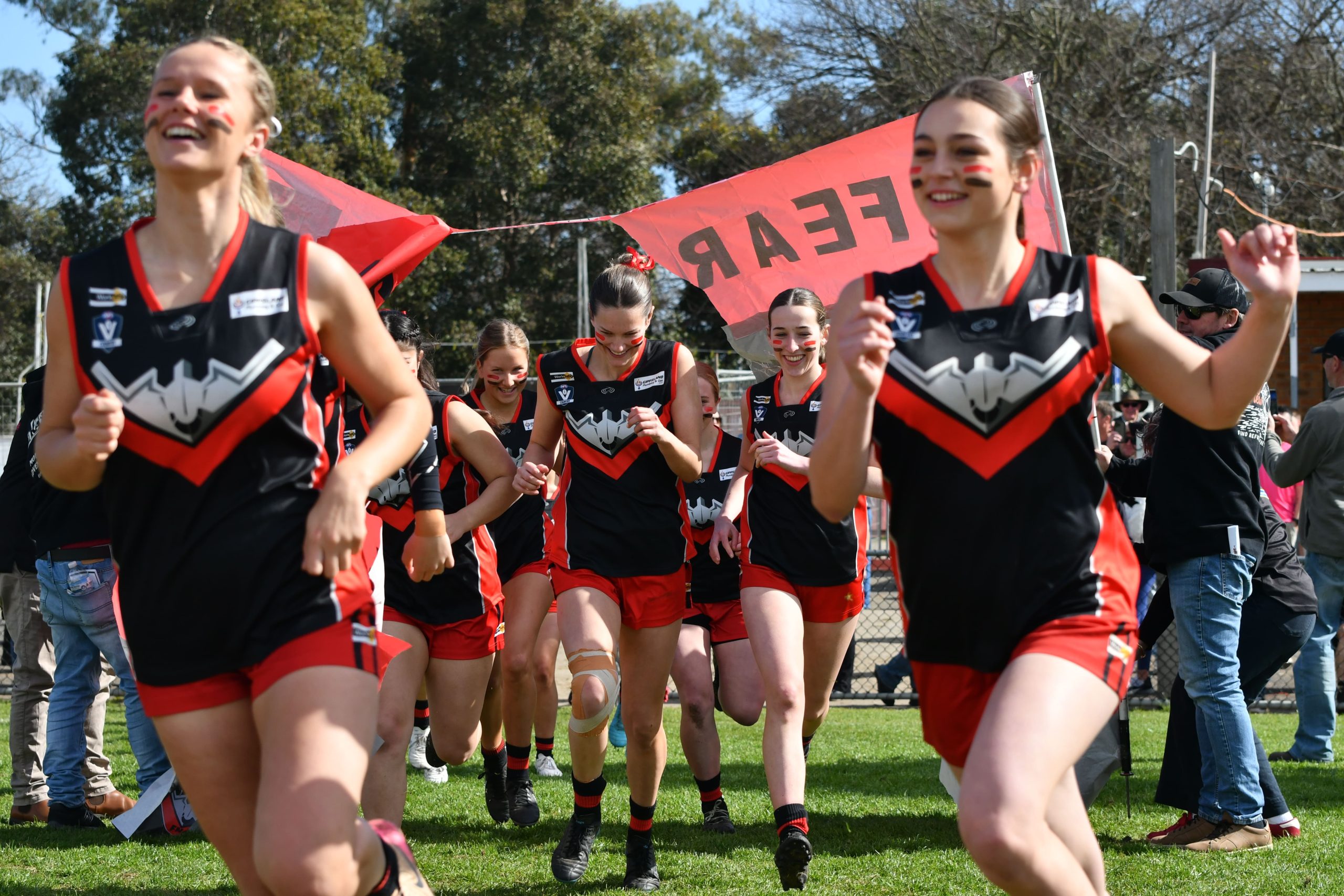 Olive Brooks and Lara Dowsett lead out a smiling Boisdale-Briagolong youth girls team. They went on to win the 2025 FFG division two premiership against Nar Nar Goon by four points. Photo: Erika Allen