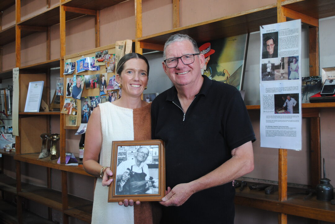 Brian Schuback and his daughter Quinn Bird hold a photograph of founder Don Schuback inside the family’s Raymond Street store, representing the three generations who carried on the Schuback Shoes legacy for nearly 70 years. Photo: Erika Allen