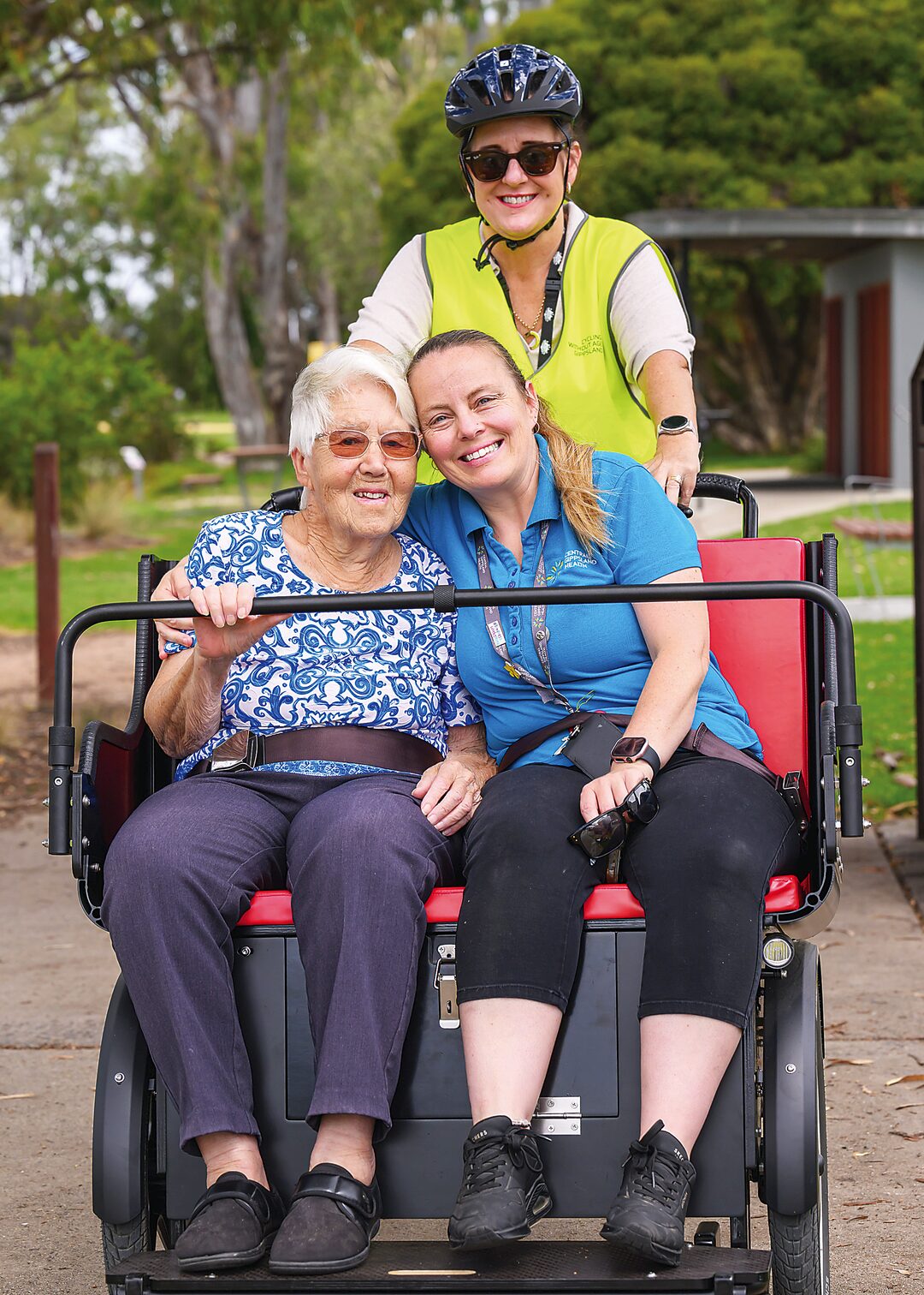 Shirley Boulton with McDonald Wing staff member Mel Baker and volunteer pilot Gemma Westman during a trishaw ride around Lake Guthridge. Photo: Contributed