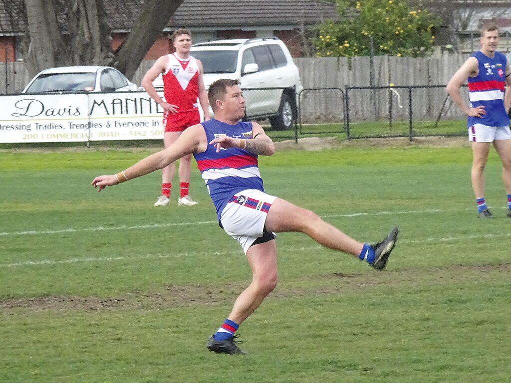Sale City veteran Daniel Bird kicks the first goal of the game against Yarram. The Bulldogs ended the Demons season, after winning by 34 points. Yarram will miss North Gippsland finals for the first time since 2015. Photo: Laurie Smyth