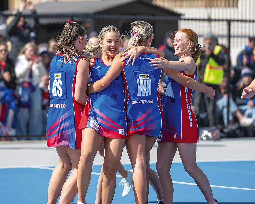 Sale City's 17 & Under netballers celebrate their Grand Final victory.