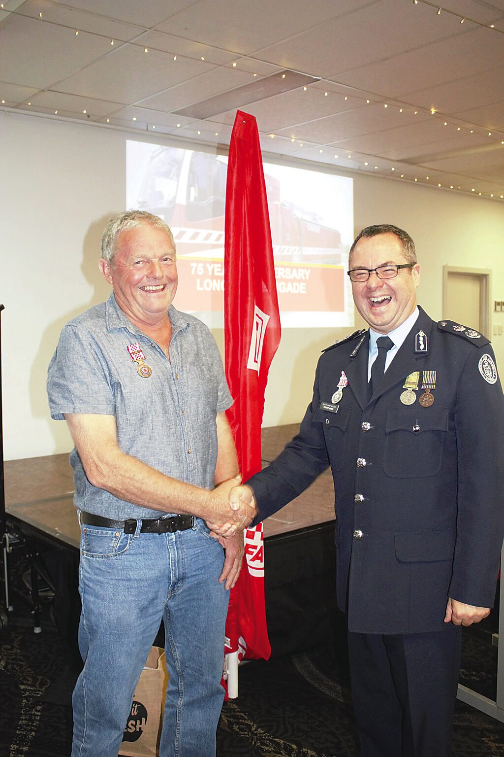 Russell Heywood was presented his 40 years service medal by Deputy Group Officer Trevor Owen. Photo: Contributed