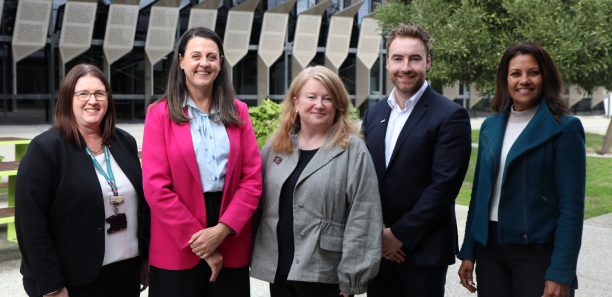 From left, TAFE Gippsland director educational delivery Linda Austin, then TAFE Gippsland chief executive Laura Macpherson, Marinus Link chief executive Stephanie McGregor, Marinus Link communications and engagement specialist Justin White and TAFE Gippsland strategic advisor for clean energy Veronica Quinless. Photo: Contributed