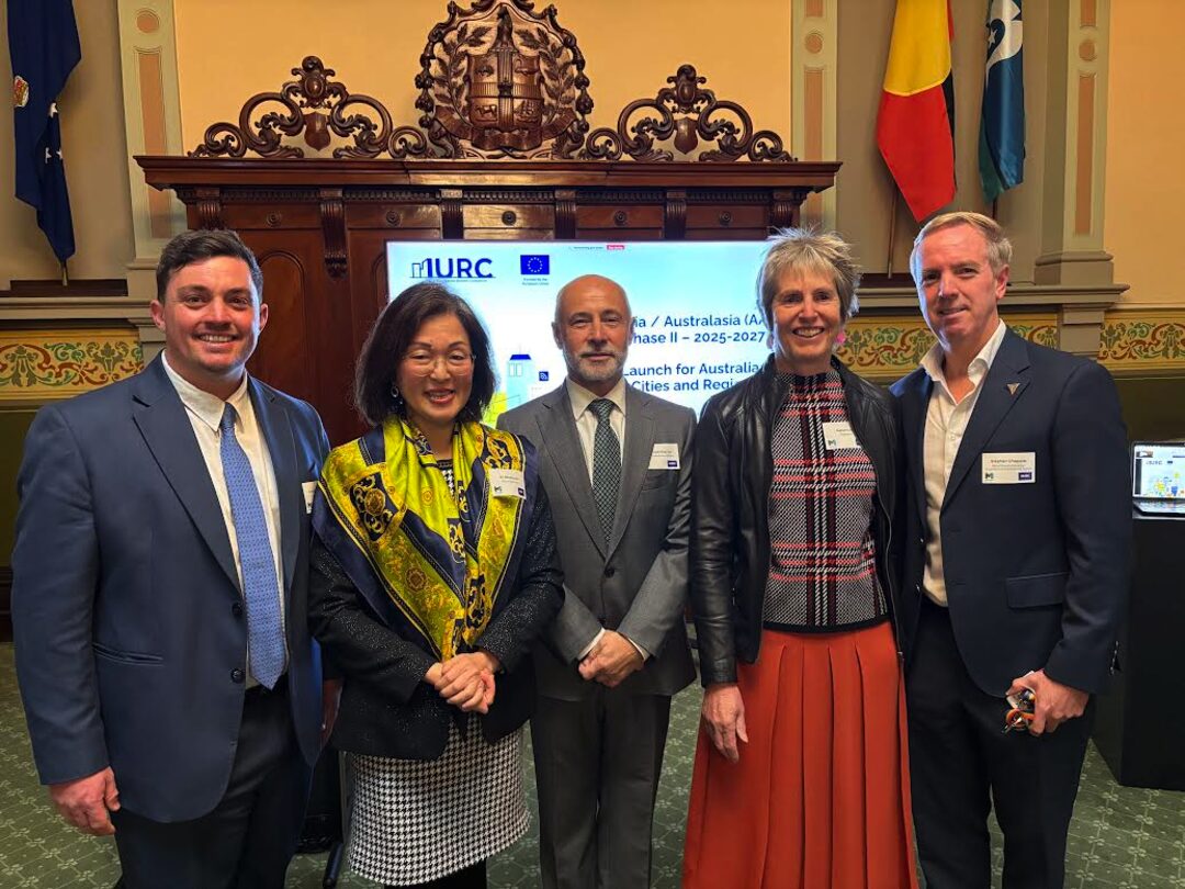 (From left to right) One Gippsland chair Nathan Hersey, City of Melbourne councillor Gladys Liu, European Union Ambassador to Australia Gabriele Visentin, Transition and Recovery Australia director Karen Cain, and Department of Energy, Environment and Climate Action regional director for Port Phillip Stephen Chapple were pictured at the Melbourne launch of the second phase of the International Urban and Regional Cooperation (IURC). Photos: Contributed