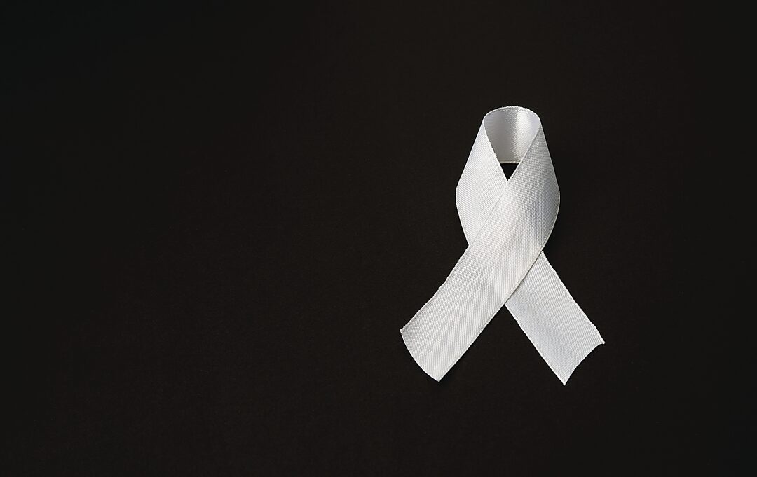 Top view of a white ribbon on a black background. The 25th of November of each year is the international day to end violence against women and children