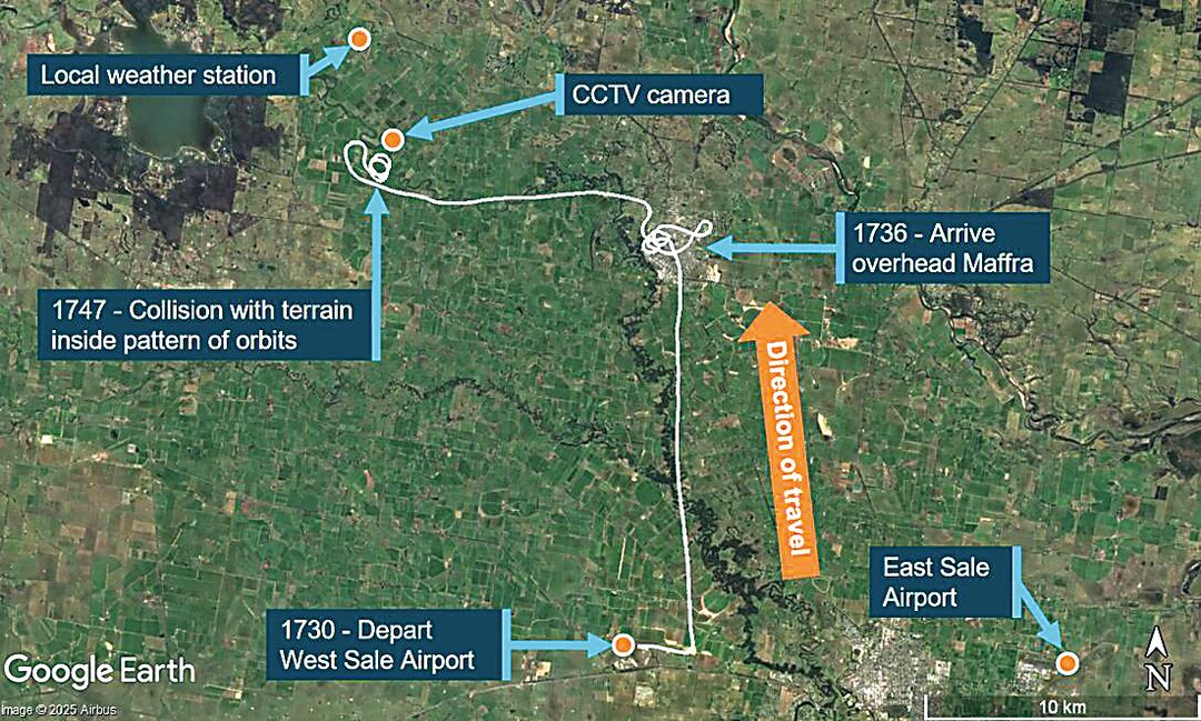 Accident flightpath with key timings and locations. Image: Airservices Australia and Google Earth, annotated by the ATSB