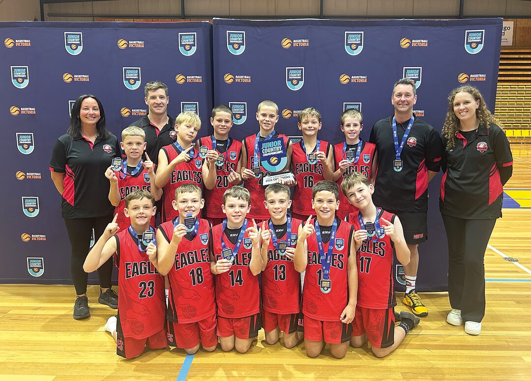 The Maffra Eagles under 12 boys' basketball team claimed the country championship at the weekend. Pictured (back row, from left) are team manager Kayleen Robinson, assistant coach Dan O'Brien, head coach Matt Cameron, asstistant coach Ash Higgins, (middle) Perry Killoran, Charlie Cromb, Alby Bramich, Nixon Killoran, Harley Gieschen, Jimmy Stobie, (front) Tanner Bedggood, Tahlan Bedggood, Tavvi Johnston, Oscar O'Brien, Lucas Robinson and Dylan Hood.