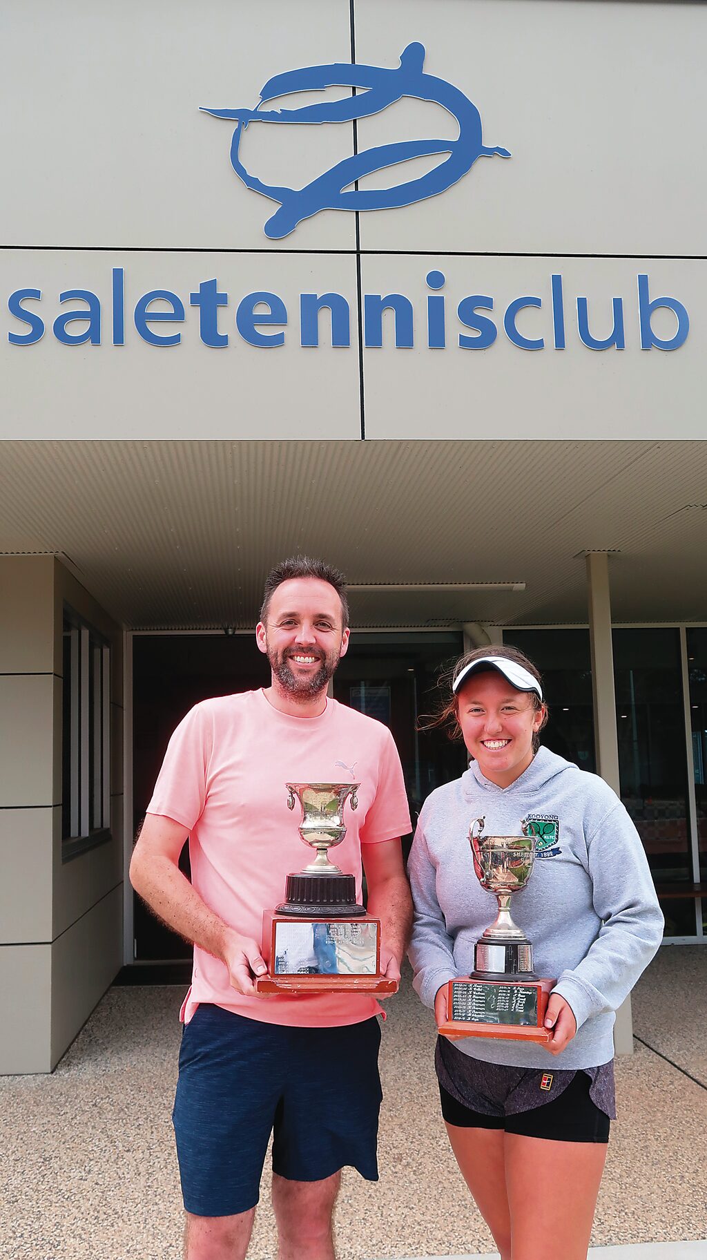 Sale Tennis Club championship winners Mark Elliman (Open Men’s Singles) and Jess Board (Open Women’s Singles). Photo: Robin Lowe.