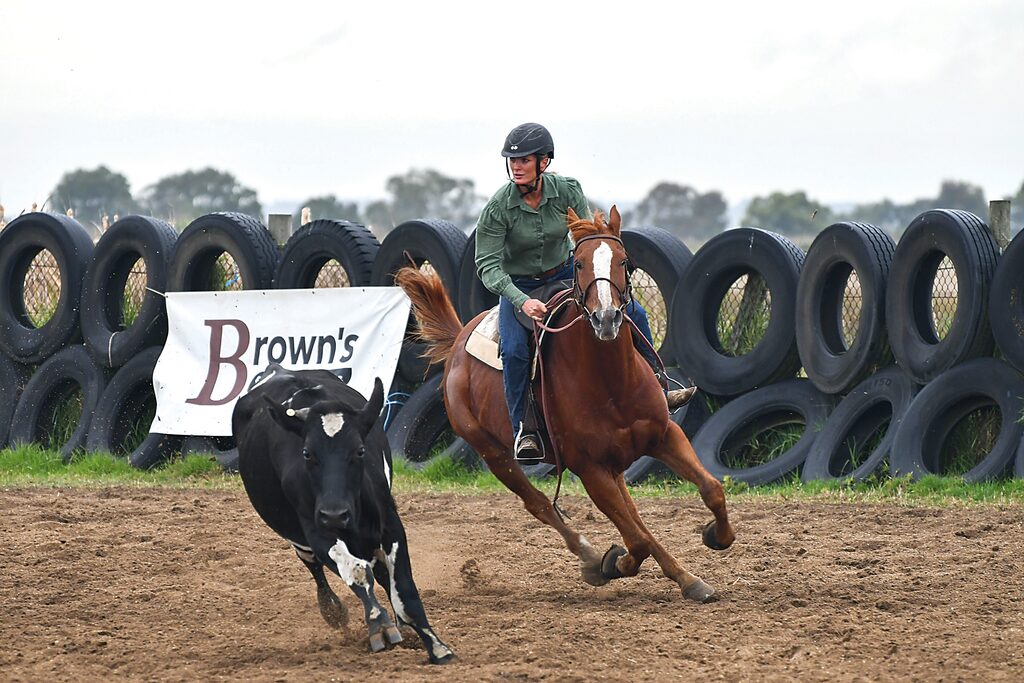 Sale’s Janelle Kennedy riding Felon as they maneuver the cow around the first peg.