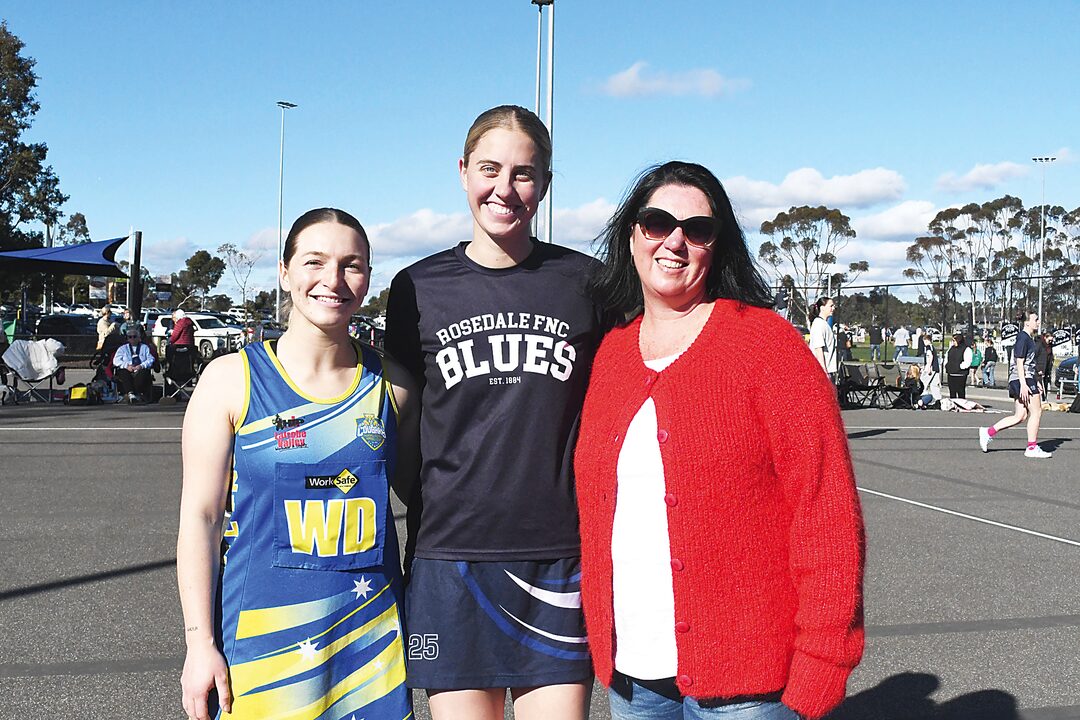 On Saturday, six Rosedale Netball-Football Club teams wore pink socks in support of Brave Beauties. Board member Toni Mackay tossed the coin for the A grade game. Toni (right) is pictured with Churchill captain Emily Lugton and Rosedale’s Meg Gordyn. Photo: Fiona Nicholson