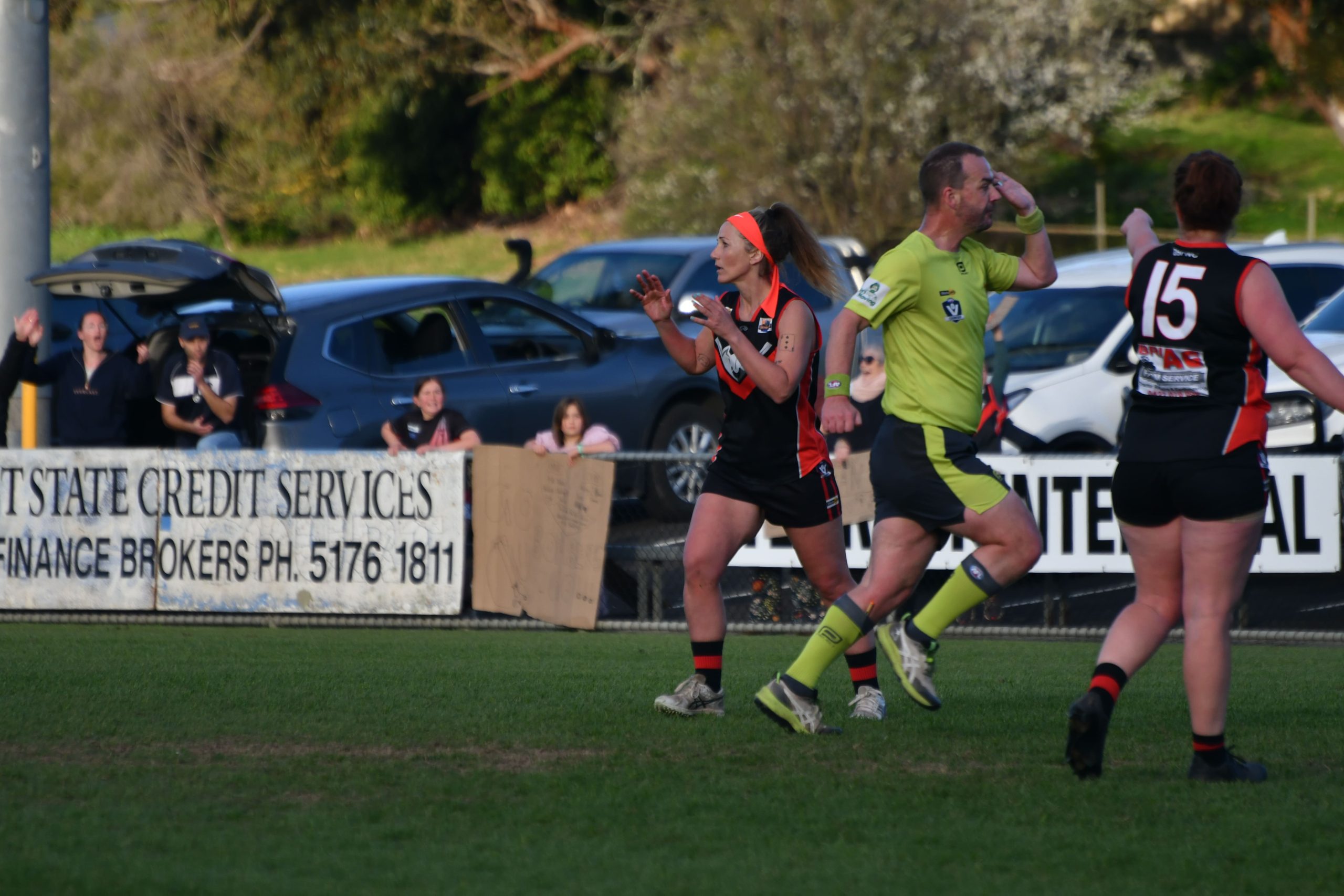 As Amanda Hancock despairs, the umpire rushes by having blown the whistle before the siren, awarding Hancock a free kick as a Swampies player infringed the protected space.