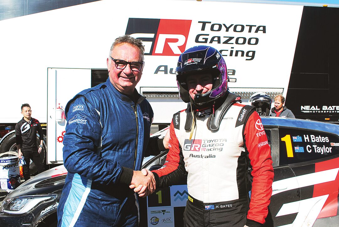 Wellington Shire mayor Scott Rossetti (left) had a taste of rally action, being driven by Australian rally champion Harry Bates ahead of the Gippsland Rally. Bates placed second at the weekend. Photo: Stefan Bradley