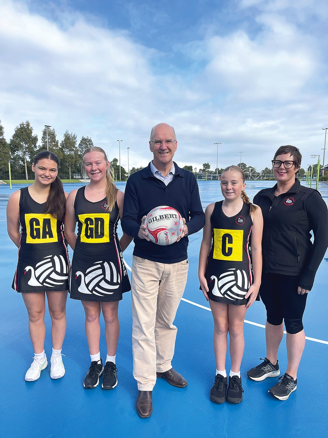 Member for Gippsland South Danny O'Brien is encouraging eligible families to apply for a $200 voucher or reimbursement through the Get Active Kids program. Mr O'Brien (centre) said pictured with (from left) Sale Netball Association players Lilli O'Brien, Charli Paterson and Myah Paterson and SNA representative netball coordinator Sheree Pape. Photo: Contributed
