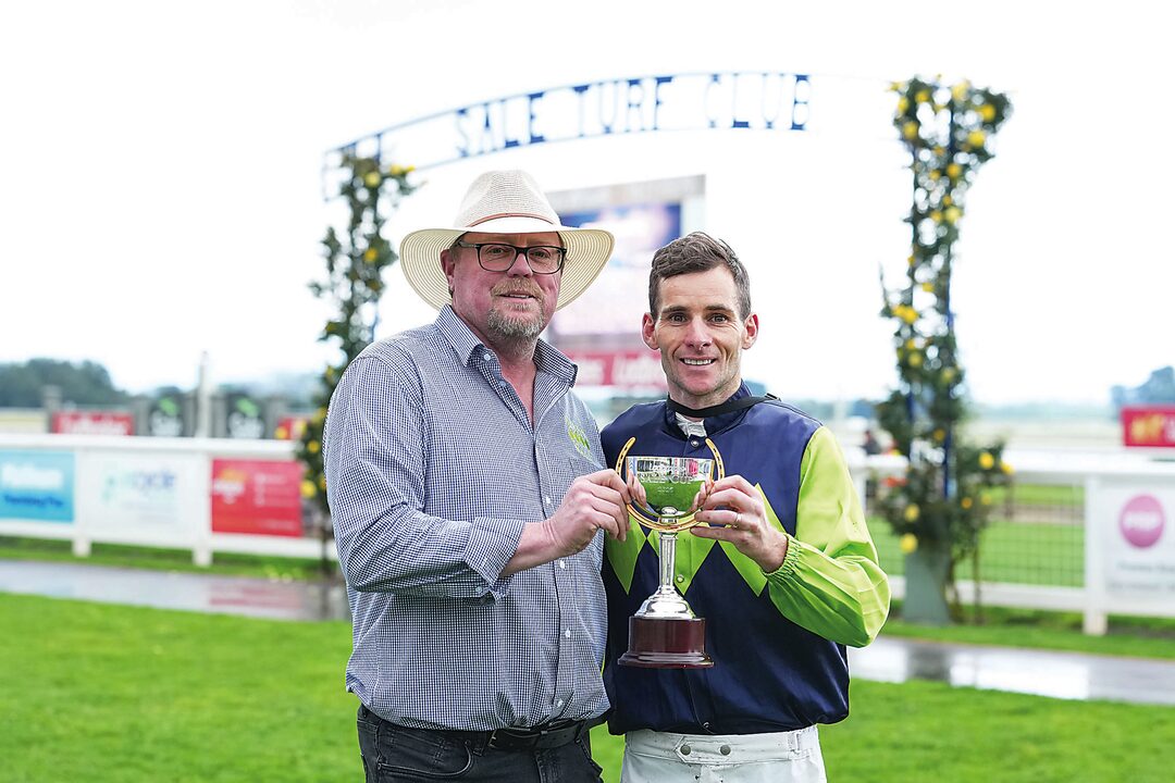 John McArdle and Jamie Mott pose with the Sale Cup after El Rocko’s win.