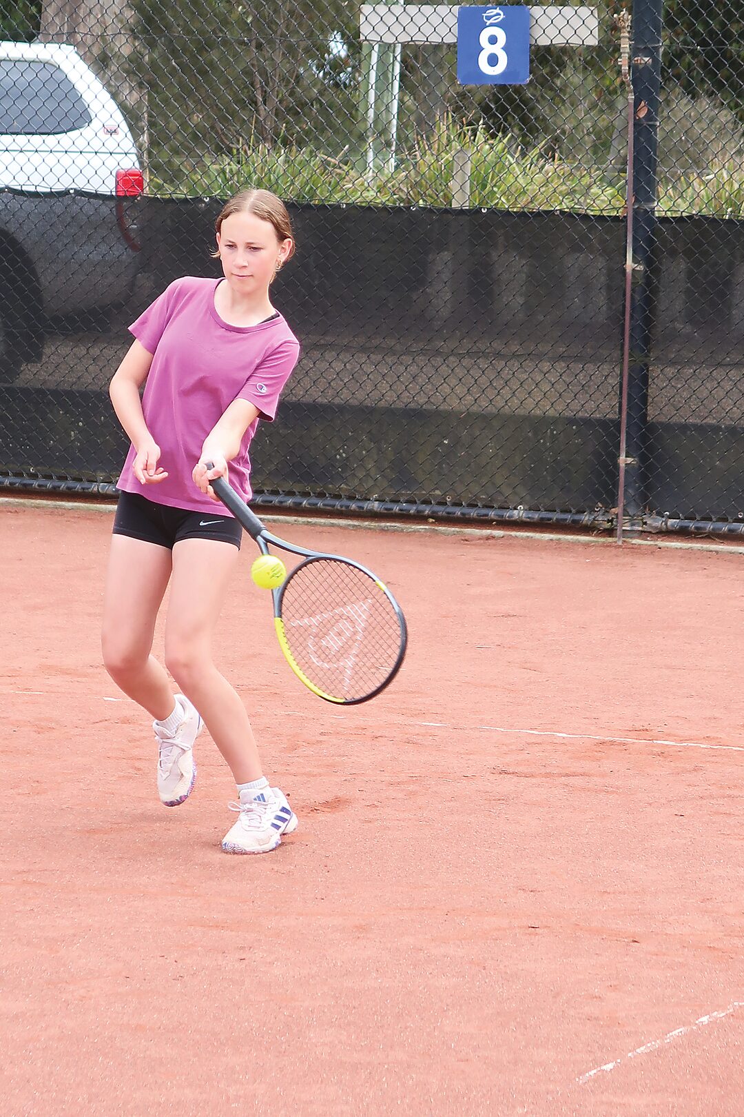 Sale Gippsland Mortgage Solutions’ Madison Sweeney plays a forehand in mid-court during her junior section four match against Sale Highgrove Bathrooms.