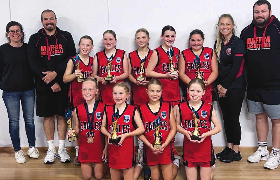 The Maffra under 12 girls, (back row, from left) team manager Anna Dick, coach Steve Battista, Milla Battista, Kloe Dick, Bay Oldham, Harper Fulford, Sailor McQuillen, team manager Carley Emanuelli and assistant coach Matt Bayless.Photos: Contributed