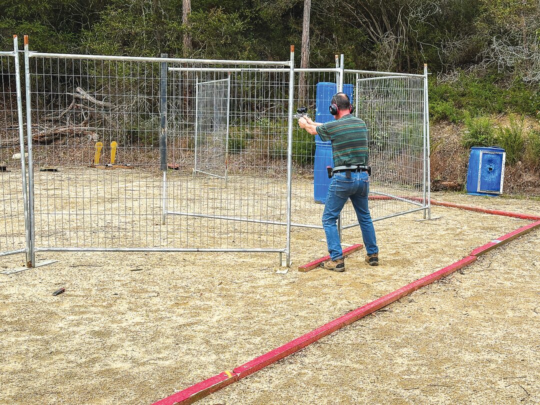 Sale Pistol Club member Mick demonstrating a shooting challenge.