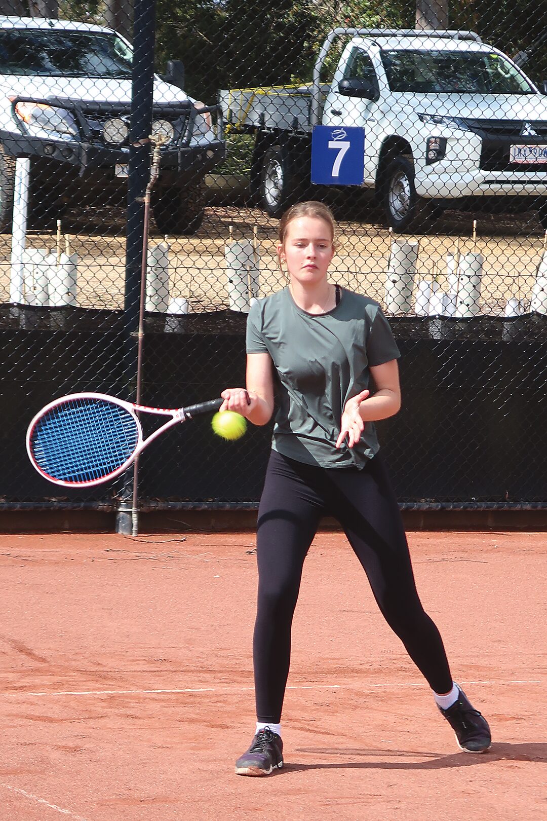 Sale Dahlsens’ Adelline Bertino launches into a cracking forehand during the sectin two match against Heyfield Rockys.