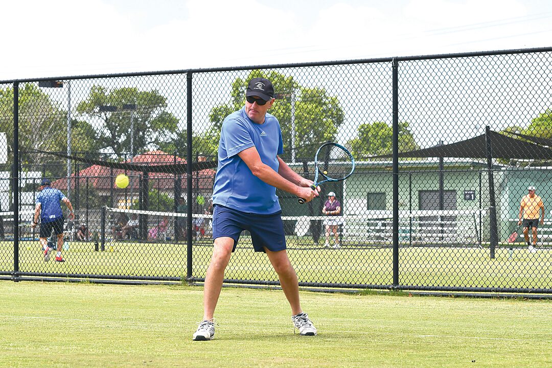 Maffra Wellington Real Estate section two player Mick Caffrey draws the racquet to hit a backhand.