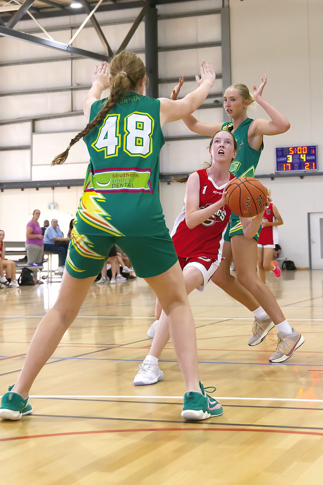 Under 19 Sonic Ava Armstrong steps around Leongatha opponents.