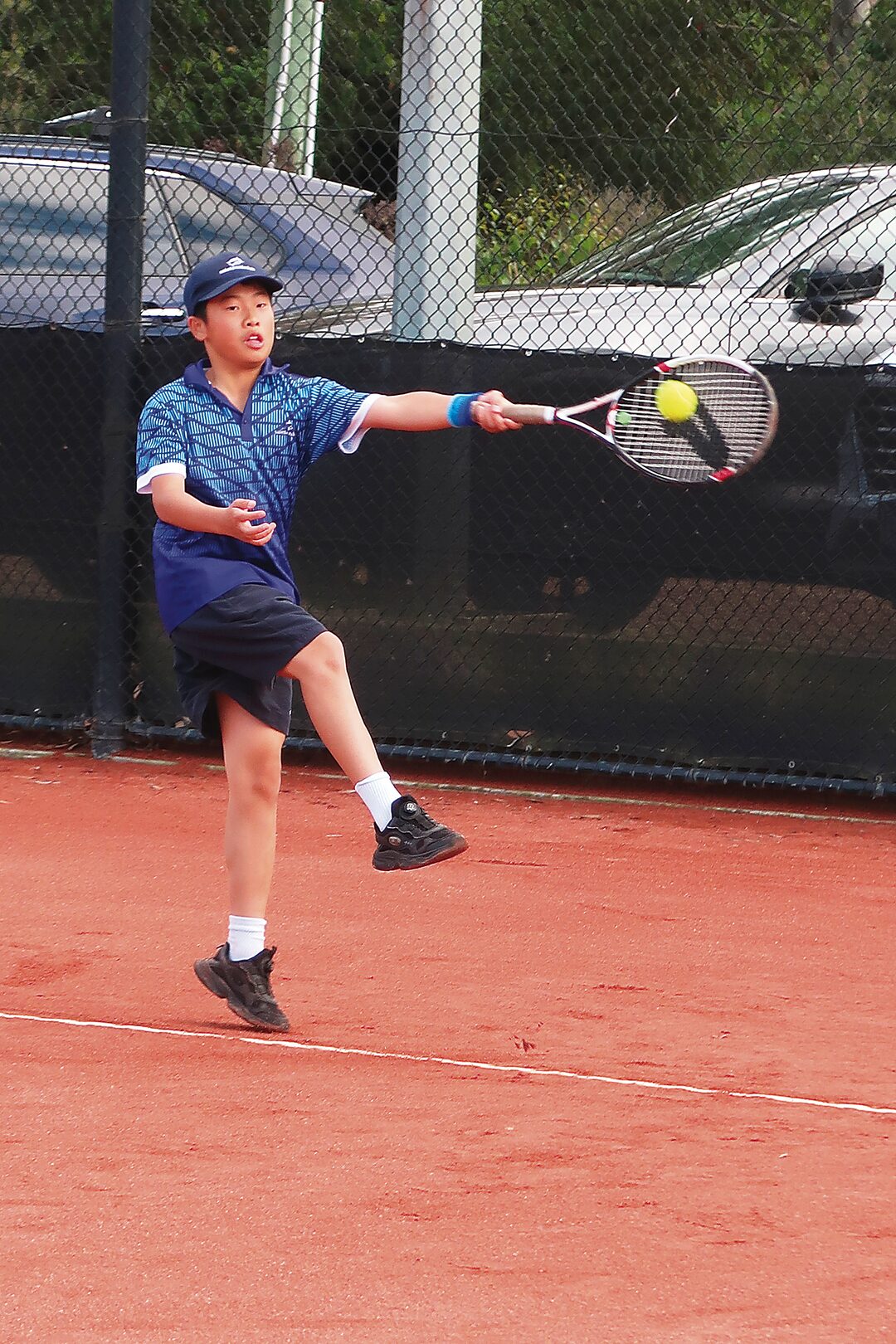 Section four junior, Henry Zhang of Sale, retrieves a deep forehand at full stretch.