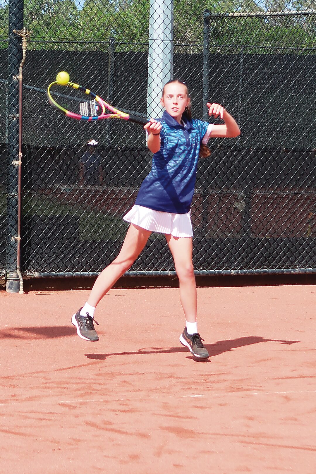 Section three junior, Lexie Elliman of Sale, plays a forehand behind the baseline.