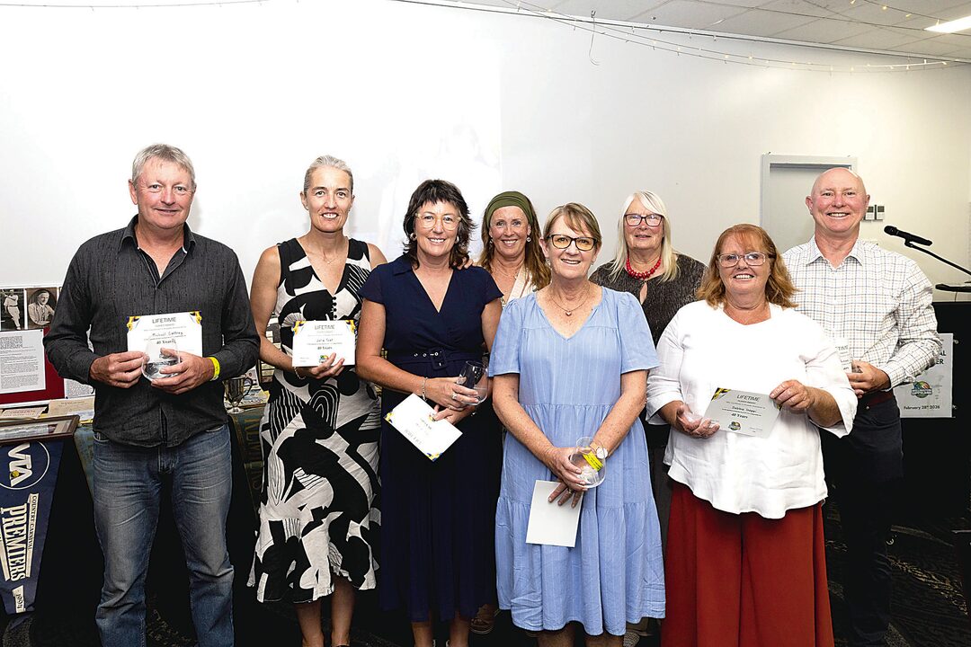 Forty-year players Mick Caffrey, Julie Foat, Ros Allman, Kerrie Brown, Dianne Sundermann, Wendy Fuessell, Debbie Iseppi and Robin Lowe.