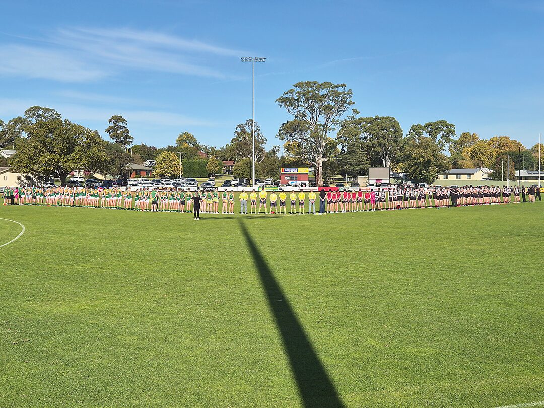 Members of the Maffra and Leongatha senior and reserves football and A grade netball teams, and umpires line-up on the ground to observe a playing of The Last Post on the scoreboard as part of the Anzac round.